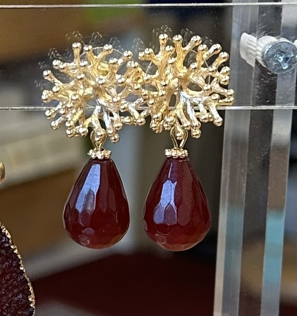 Oorbellen met oorsteker 24K goldplated en druppel agaat bordeauxrood
